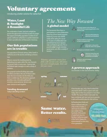 To help the State Water Board advance a water quality control plan update that truly balances the different beneficial uses in the Bay-Delta watershed, Sacramento Valley water suppliers have worked with water suppliers throughout California and various state and federal agencies to advance the program on the Agreements to Support Healthy Rivers and Landscapes (HRL), previously fashioned as voluntary agreements. We believe California needs a new approach for the Bay-Delta to help ensure water supplies for cities and rural communities, farms, fish, birds, and recreation—a modern 21st century approach to water management that will protect all beneficial uses of water.