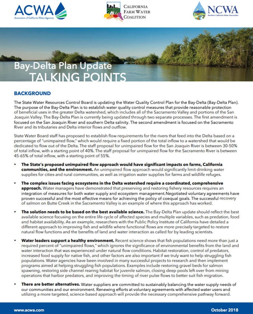 The Sacramento-San Joaquin Rivers Delta and San Francisco Bay (hereinafter “Bay-Delta”) is an important economic and environmental resource benefitting all of California and the nation. The Northern California Water Association (NCWA) and Sacramento Valley water resources managers recognize the importance to California’s future of a healthy Bay-Delta and providing high quality and reliable water supplies for all beneficial uses, including cities and rural communities, farms and ranches, fish and wildlife, recreation, and hydropower.