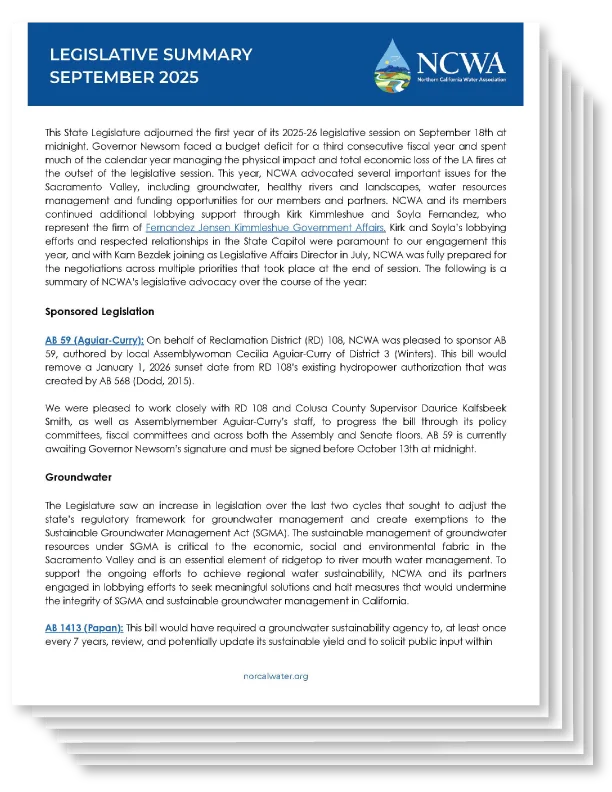 This State Legislature adjourned the first year of its 2025-26 legislative session on September 18th at midnight. Governor Newsom faced a budget deficit for a third consecutive fiscal year and spent much of the calendar year managing the physical impact and total economic loss of the LA fires at the outset of the legislative session. This year, NCWA advocated several important issues for the Sacramento Valley, including groundwater, healthy rivers and landscapes, water resources management and funding opportunities for our members and partners. NCWA and its members continued additional lobbying support through Kirk Kimmleshue and Soyla Fernandez, who represent the firm of Fernandez Jensen Kimmleshue Government Affairs. Kirk and Soyla’s lobbying efforts and respected relationships in the State Capitol were paramount to our engagement this year, and with Kam Bezdek joining as Legislative Affairs Director in July, NCWA was fully prepared for the negotiations across multiple priorities that took place at the end of session.