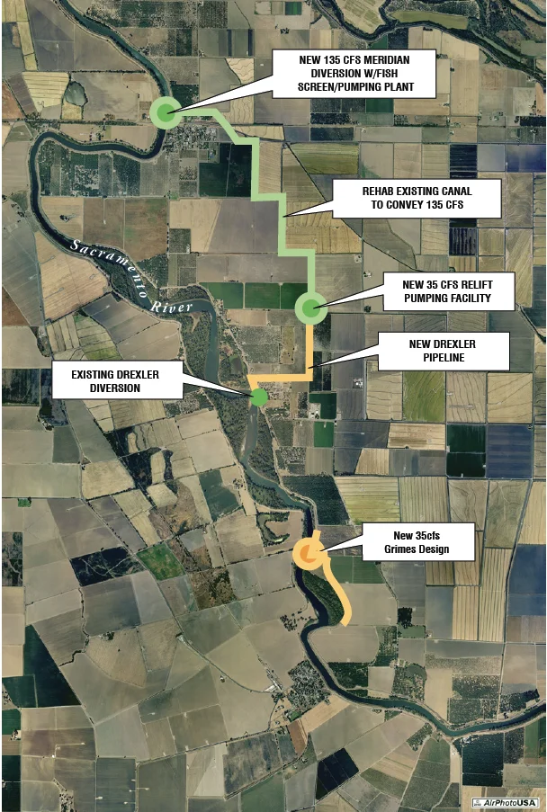 The completion of this project will bring to a close a more than two-decade effort by Meridian Farms to provide these protections to fish in the Sacramento River. Meridian Farms Water Company provides irrigation water to about 10,000 acres in three distinct service areas in Sutter County, bounded by Sutter Bypass on the east and north, Tisdale Bypass on the south and the Sacramento River.