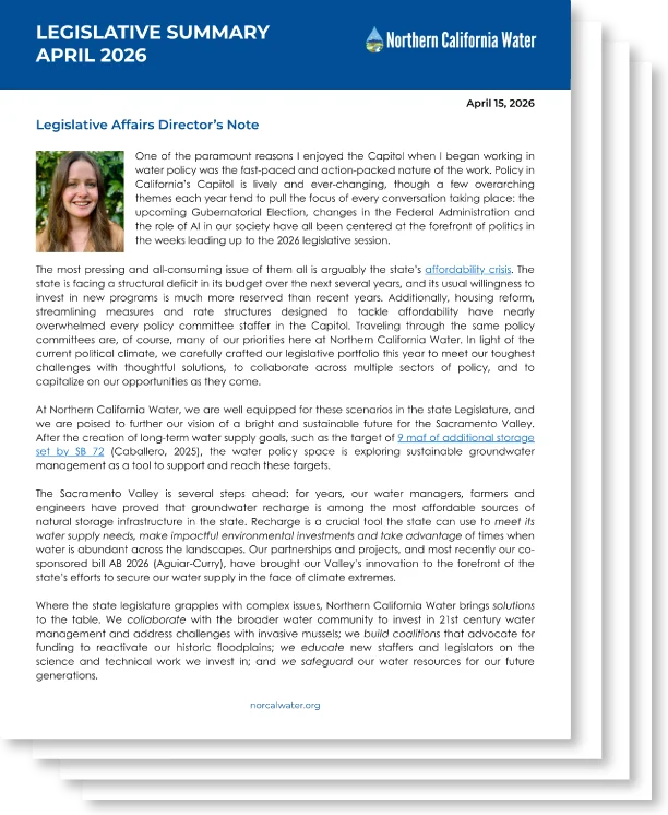 The most pressing and all-consuming issue of them all is arguably the state’s affordability crisis. The state is facing a structural deficit in its budget over the next several years, and its usual willingness to invest in new programs is much more reserved than recent years. Additionally, housing reform, streamlining measures and rate structures designed to tackle affordability have nearly overwhelmed every policy committee staffer in the Capitol. Traveling through the same policy committees are, of course, many of our priorities here at Northern California Water. In light of the current political climate, we carefully crafted our legislative portfolio this year to meet our toughest challenges with thoughtful solutions, to collaborate across multiple sectors of policy, and to capitalize on our opportunities as they come.