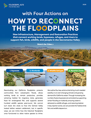 Spanning from Chico to the Delta, and from the Sierra Nevada to the coast ranges, nearly the entire Sacramento River Basin is part of the historic floodplain that provided an abundance of habitat for fish and wildlife. Construction of levees and dams may have altered the landscape, but the Floodplain Forward Coalition is working on innovative ways to reconnect the rivers to the floodplains, while still providing critical flood protection.